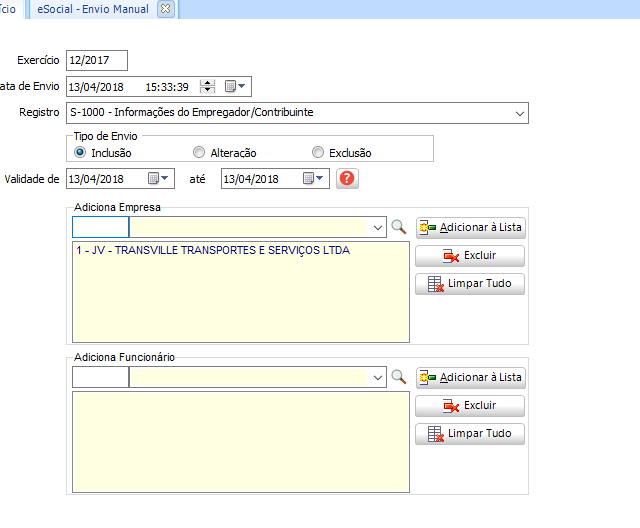 - Tipo de Envio, esse campo serve para o cadastramento inicial, no caso de um novo registro como uma nova rubrica ou um novo horário cadastrado deve ser utilizado Inclusão, em caso de uma alteração de cadastro como por exemplo mudar o endereço da empresa deve ser enviado como Alteração e caso aquela informação não seja mais necessária deve ser enviado como Exclusão;