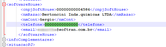 Nesse caso podemos ver que o telefone da empresa está incorreto, então podemos resolver da seguinte forma, primeiramente abrimos o XML e identificamos a TAG onde está sendo acusado o problema, para este caso temos a tag telefone dentro da tag softwareHouse: