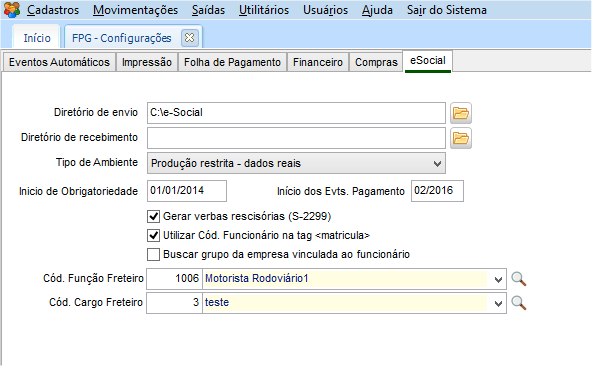 No módulo CFG, na rotina Utilitários > Configurações > Recursos Humanos > FPG – Folha de Pagamento, na guia eSocial é possível informar os diretórios de envio e recebimento dos arquivos, o tipo de ambiente e a data de início da obrigatoriedade