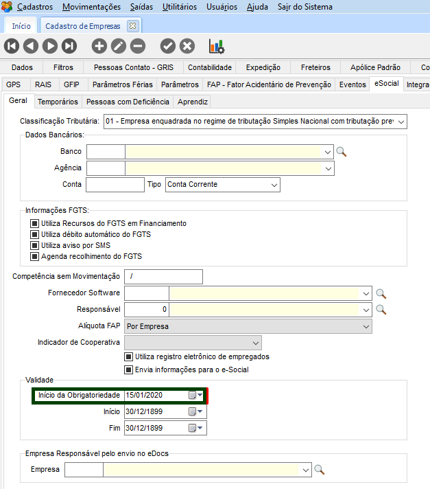 - Validade, o período de validade é válido para o cadastramento inicial e define por quanto tempo a informação será válida, em casos onde o prazo não for definido basta informar a validade final igual a validade inicial;