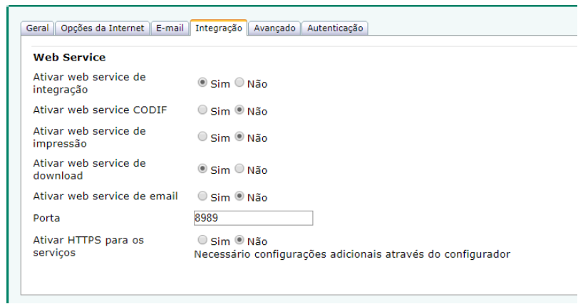 Para que o eDocs habilite os serviços de integração é preciso realizar as seguintes configurações na guia Geral/Integração: