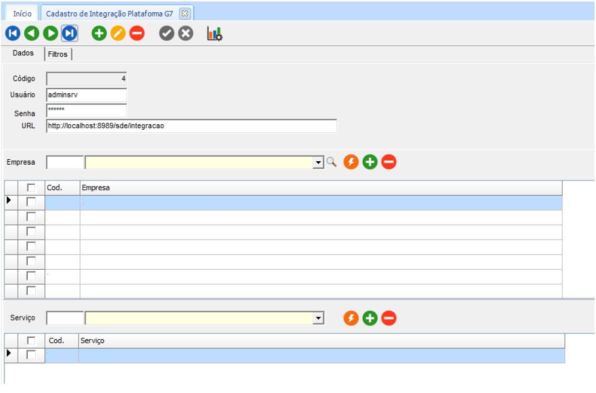 No módulo CFG, na rotina Cadastro Integração Plataforma G7, deve ser configurado da seguinte forma: