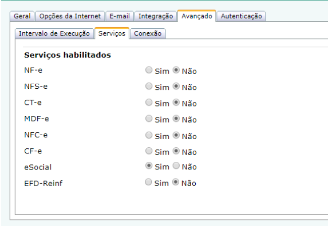Para que o eDocs seja habilitado para integrar o eSocial é preciso ativar o serviço na guia Geral/Avançado/Serviços, marcado a opção eSocial como Sim.