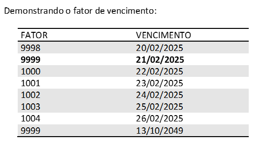 A contagem do fator passa a ser a quantidade de dias contados entre 21/02/2025 e a data do vencimento do título (se maior que 21/02/2025). A geração dos códigos de barras dos títulos gerados pelos créditos, deve ser ajustada para contemplar à nova regra: