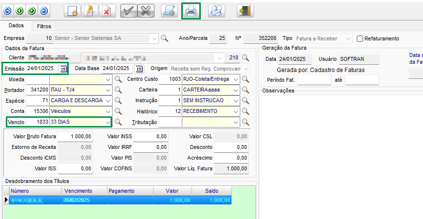 Para utilizar, na tela de Movimentação de Faturas, clique em Imprimir.