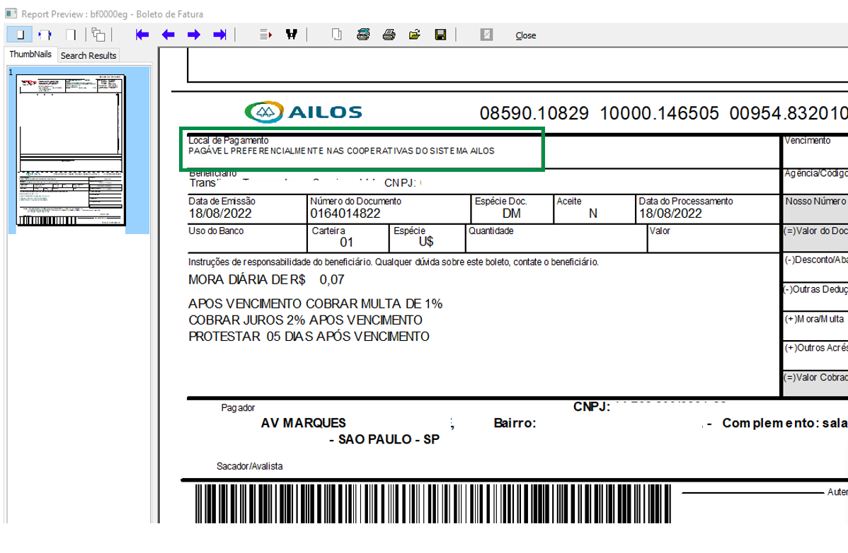 Irá apresentar a seguinte mensagem nas informações do local de pagamento: Pagar preferencialmente nas cooperativas do Sistema AILOS.