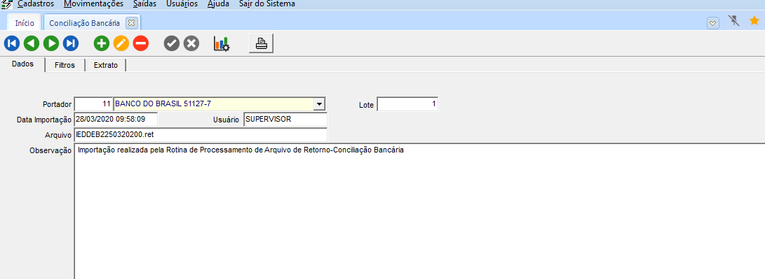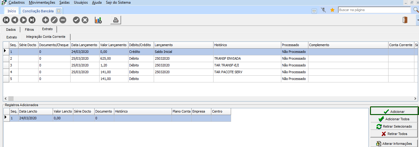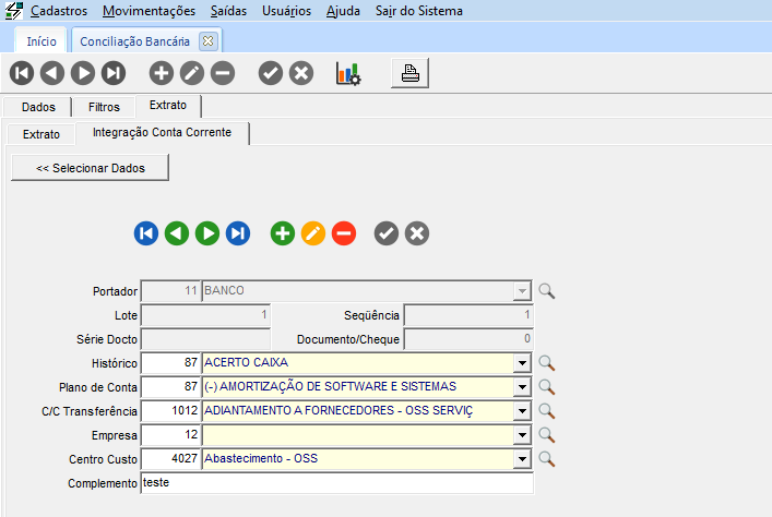 Os registros da Conciliação Bancária não podem ser alterados, ou seja, não podem ser inseridos registros, editados ou excluídos. Apenas os registros da guia Integração Conta Corrente podem ter seus registros alterados.