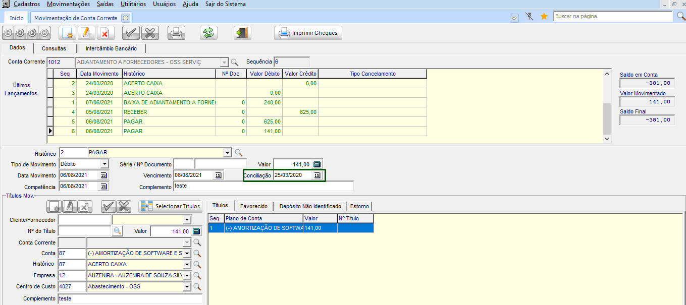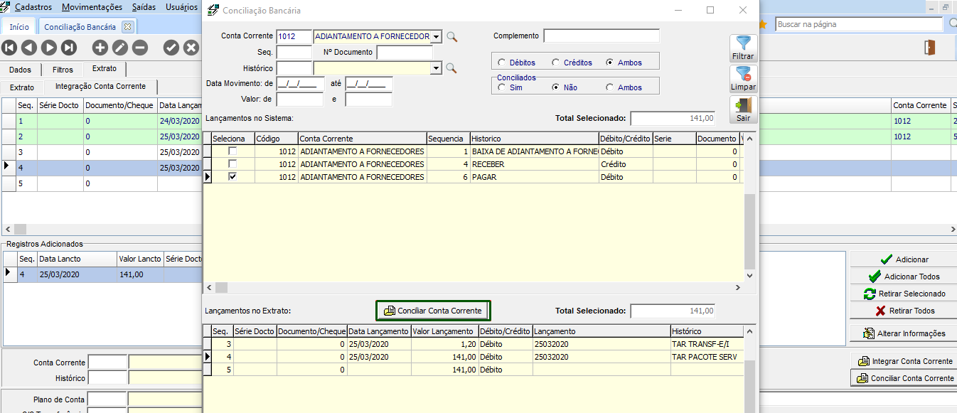 Nesta rotina também é possível conciliar movimentos de conta corrente com o extrato da conciliação bancária. Basta selecionar item do registro de extrato com movimentação de conta corrente de mesmo valor.