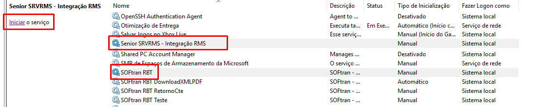 Na tela de serviços, iniciar os serviços de Senior SRVRMS – Integração RMS e SOFtran RBT.