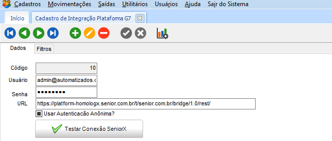 No módulo CFG, em Cadastros > Cadastro Integração Plataforma G7, ter o usuário, senha e URL configurado com o cadastro da empresa, de acesso ao TMS > RMS.