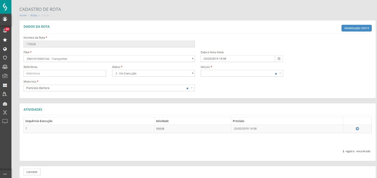 Utilizado a mesma rota do exemplo anterior. No RMS, em Logística | WMS TMS > Otimização Logística > Roteirização e Monitoramento > Consultas > Rotas e Viagens, seguir o processo pelo botão Roteirização > Reabrir > Confirmar.