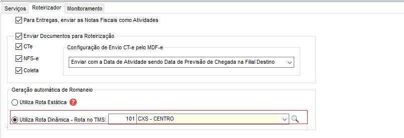 • Rota dinâmica: o que for informado na configuração do CFG, será considerado como confirmação no RMS para o TMS, ou seja, não será verificado nenhum cadastro de rota ou região, automaticamente será gravado com a rota informada na configuração.