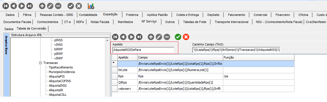 Acesse o módulo CFG em Cadastros > Empresas > aba Expedição sub aba NF Serviço sub aba Tabela de Conversão.