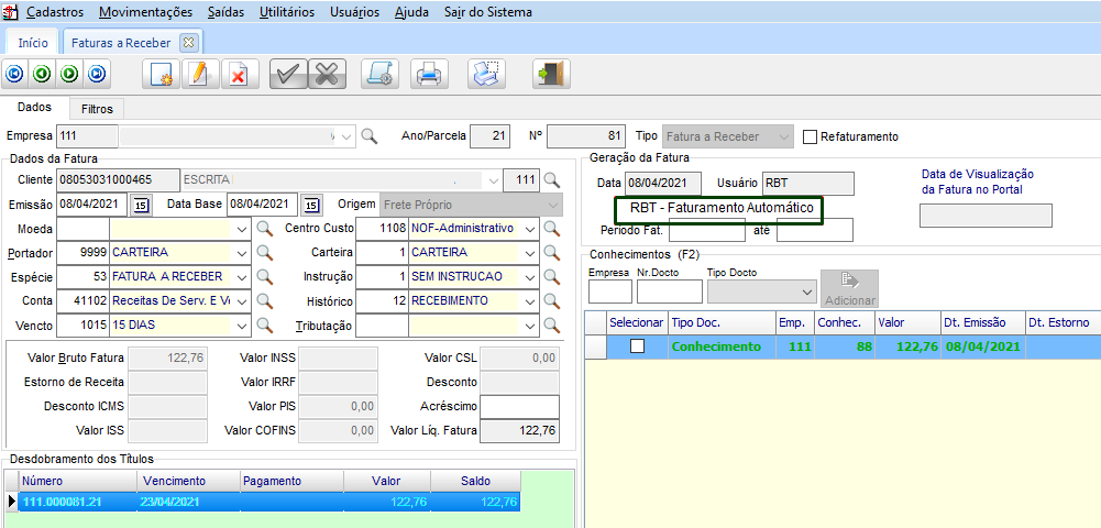 Ainda no módulo FAT, em Movimentações > Faturas, consulte a fatura gerada. O sistema apresenta a descrição RBT – Faturamento Automático, para identificar que foi gerado pelo RBT: