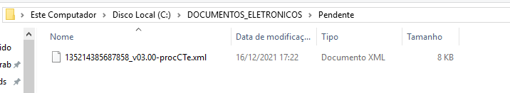 Da mesma forma, no diretório da empresa emitente do documento é criado uma pasta chamada Pendente, e transfere o XML do e-mail para esta pasta.