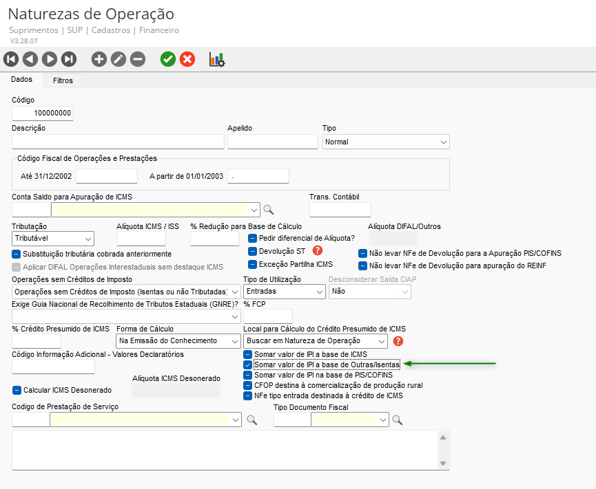 Em Cadastros > Financeiro > Natureza de Operação, marque a opção Somar valor de IPI a base de Outras/Isentas.