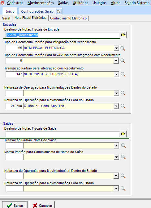 - Diretório: informe o diretório importação, se não informado o campo nesta tela o sistema irá buscar o diretório configurado no CFG e se não informado o campo no CFG, o sistema irá buscar o diretório configurado para a empresa informada em tela no cadastro da empresa