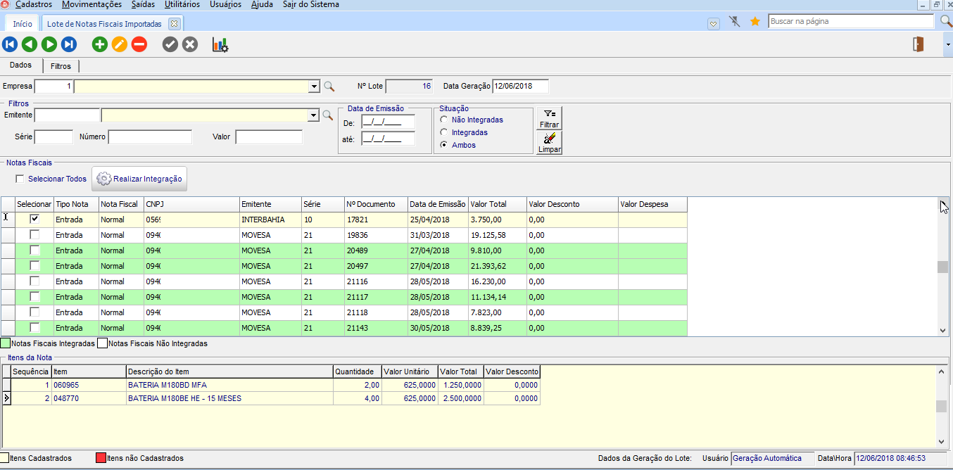Clique duas vezes em um lote ou nota, assim este será aberto na guia dados todo o lote selecionado com informações do lotem com a data de geração da importação. Onde no primeiro grid serão apresentado as Notas Fiscais integradas e não integradas, onde podem sem marcadas as notas para serem integradas: