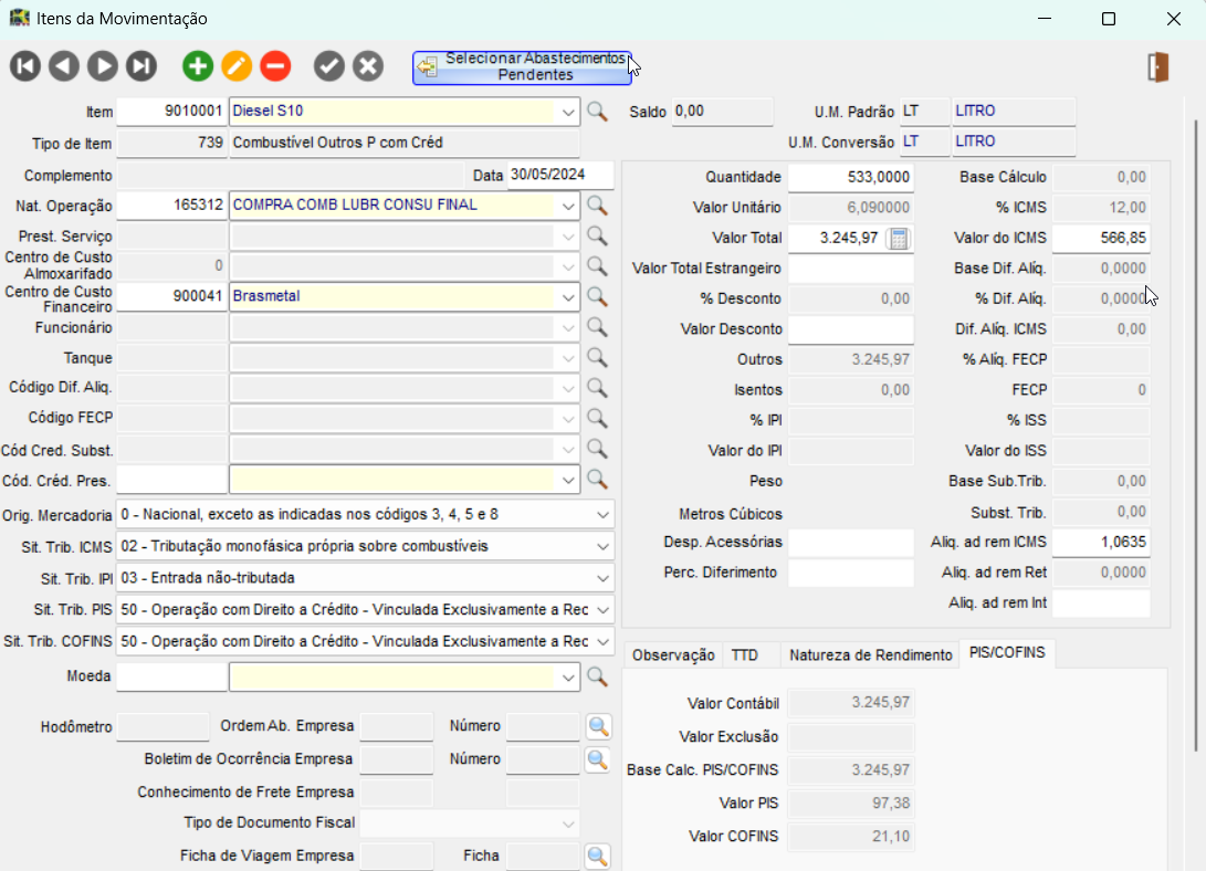Em SUP > Movimentações > Recebimento ou RDE > Movimentações > Lote de Notas Fiscais, na movimentação dos itens, na guia “PIS/COFINS” temos os campos: