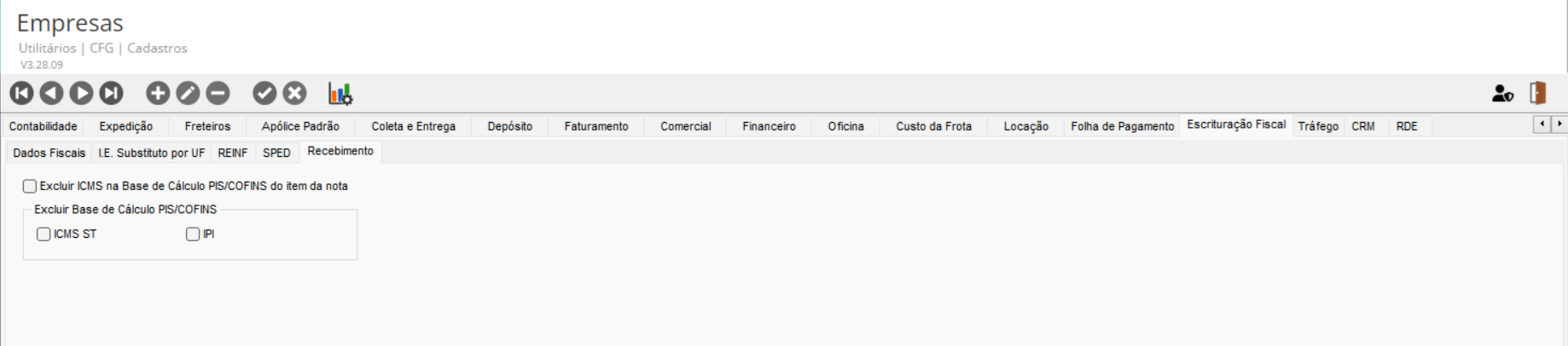 Em CFG > Cadastros > Empresa, na guia Escrituração Fiscal, sub-guia Recebimento, configure os impostos que serão excluídos da Base de PIS/COFINS do item: