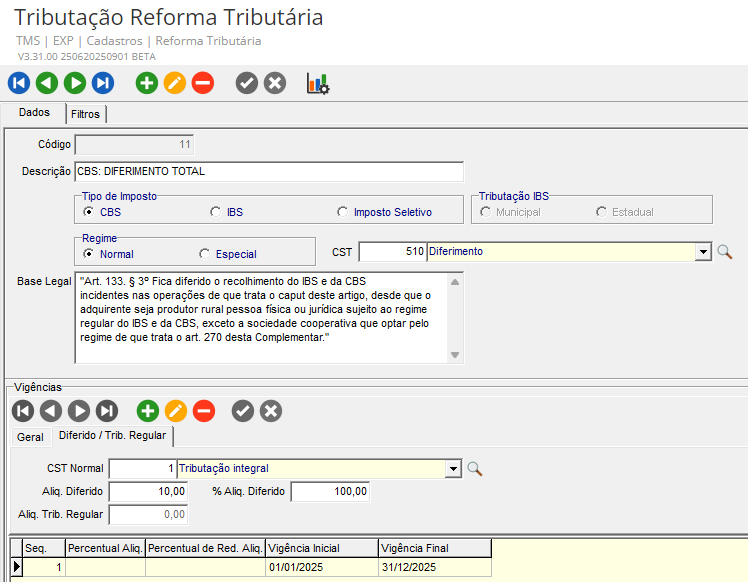- CST Normal: informe a CST de como seria a tributação caso não cumprisse a condição de Diferido ou Tributação Regular;