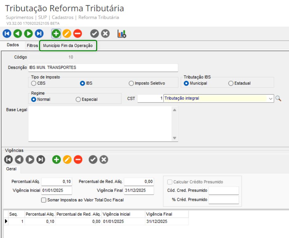 Quando for cadastrada uma tributação para o tipo de imposto IBS Municipal, será exibida a guia Munícipio Fim da Operação.