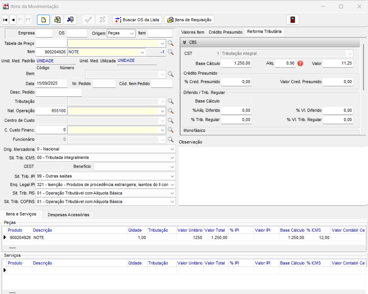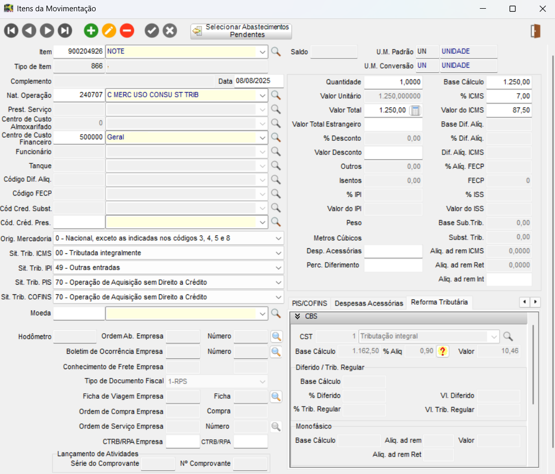 Na movimentação do item, será exibido o campo Total Item, que apresentará o valor total do item. Caso, na configuração de Tributação da Reforma Tributária, a opção Somar Imposto ao Valor Total Doc. Fiscal esteja marcada, o valor do imposto será adicionado ao Total Item.
