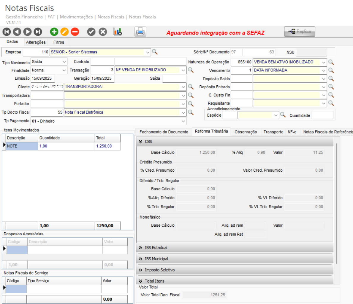 Em FAT > Movimentações > Notas Fiscais > Notas Fiscais, quando a empresa emitente estiver configurada para utilizar a Reforma Tributária e a Natureza de Operação informada na nota fiscal possuir as tributações da Reforma Tributária configuradas, os cálculos serão gerados e apresentados na guia Reforma Tributária, dentro da movimentação de itens.