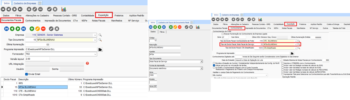 - As informações da versão do layout, série e última numeração, serão carregadas do documento fiscal vinculado no cadastro de empresa: