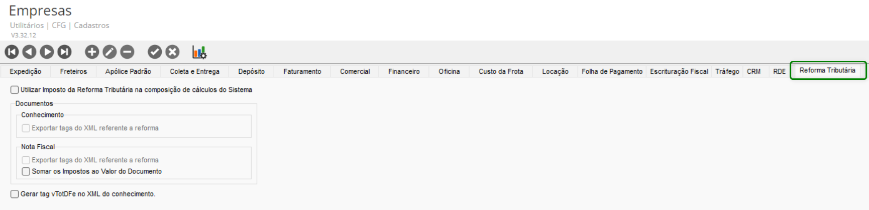 No módulo CFG, acesse Cadastros > Empresa e na guia Reforma Tributária, marque a opção Utilizar Imposto da Reforma Tributária na composição de cálculos do Sistema.