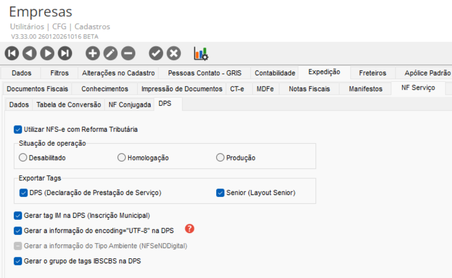 - DPS (Declaração e Prestação de Serviço): Se marcada irá gerar as tags DPS para o layout da Reforma Tributária.