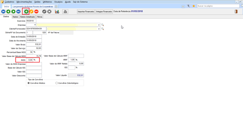 Acesse o módulo FPG em Movimentações > Preparação de Cálculo > Lançamento de Notas Fiscais de Cooperativa, e realize o lançamento de uma nota informando o valor 0,00 para o campo “INSS %”.