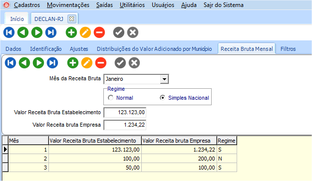 No registro 0400 do arquivo serão exportadas as distribuições cadastradas. Na guia “Receita Bruta Mensal”, deverá ser castrada as receitas brutas mensais informando os valores do estabelecimento e empresa e informando o regime para cada mês de receita bruta.