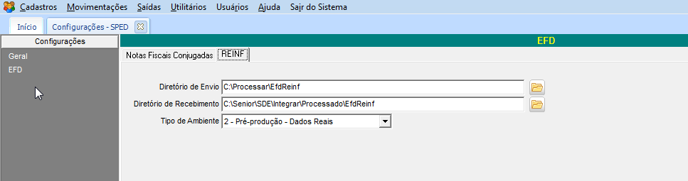 No módulo CFG, na rotina Utilitários > Configurações > SPED, acesse a guia EFD/REINF e informe os campos: