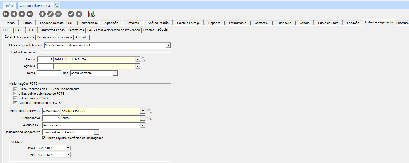 Em CFG > Cadastros > Empresas > Folha de Pagamento > eSocial > Geral, o campo Fornecedor Software deve estar preenchido;