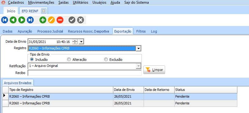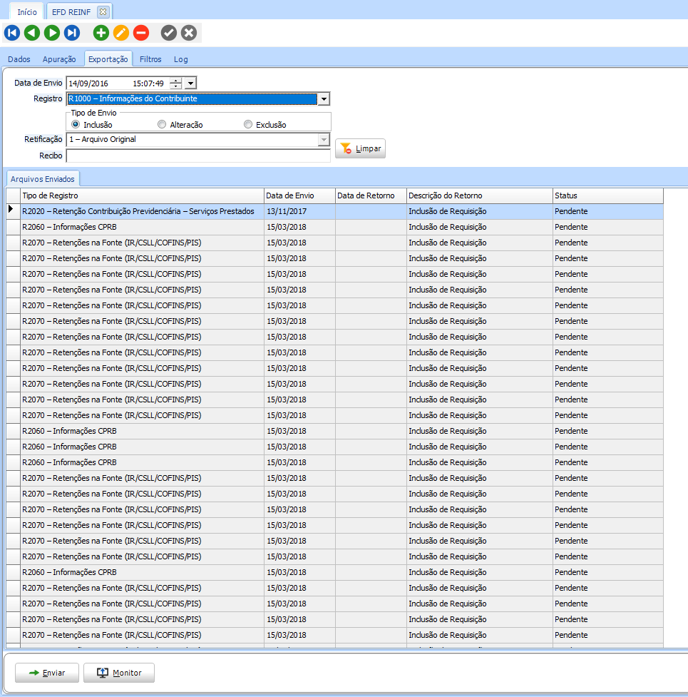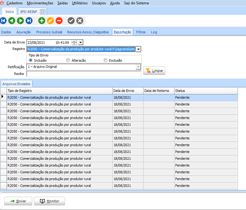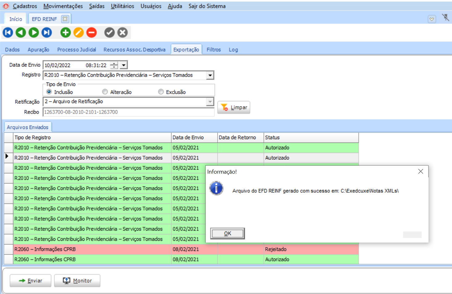 Na guia exportação é possível escolher qual o registro o usuário quer exportar para o REINF, ao clicar em Enviar é gerado o arquivo e comunicado com o eDocs quando configurado: