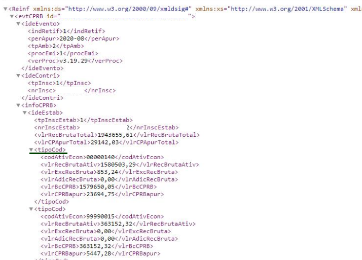 Após gerado no xml, é apresentado as informações conforme apuração, no XML essas informações serão divididas por atividade: