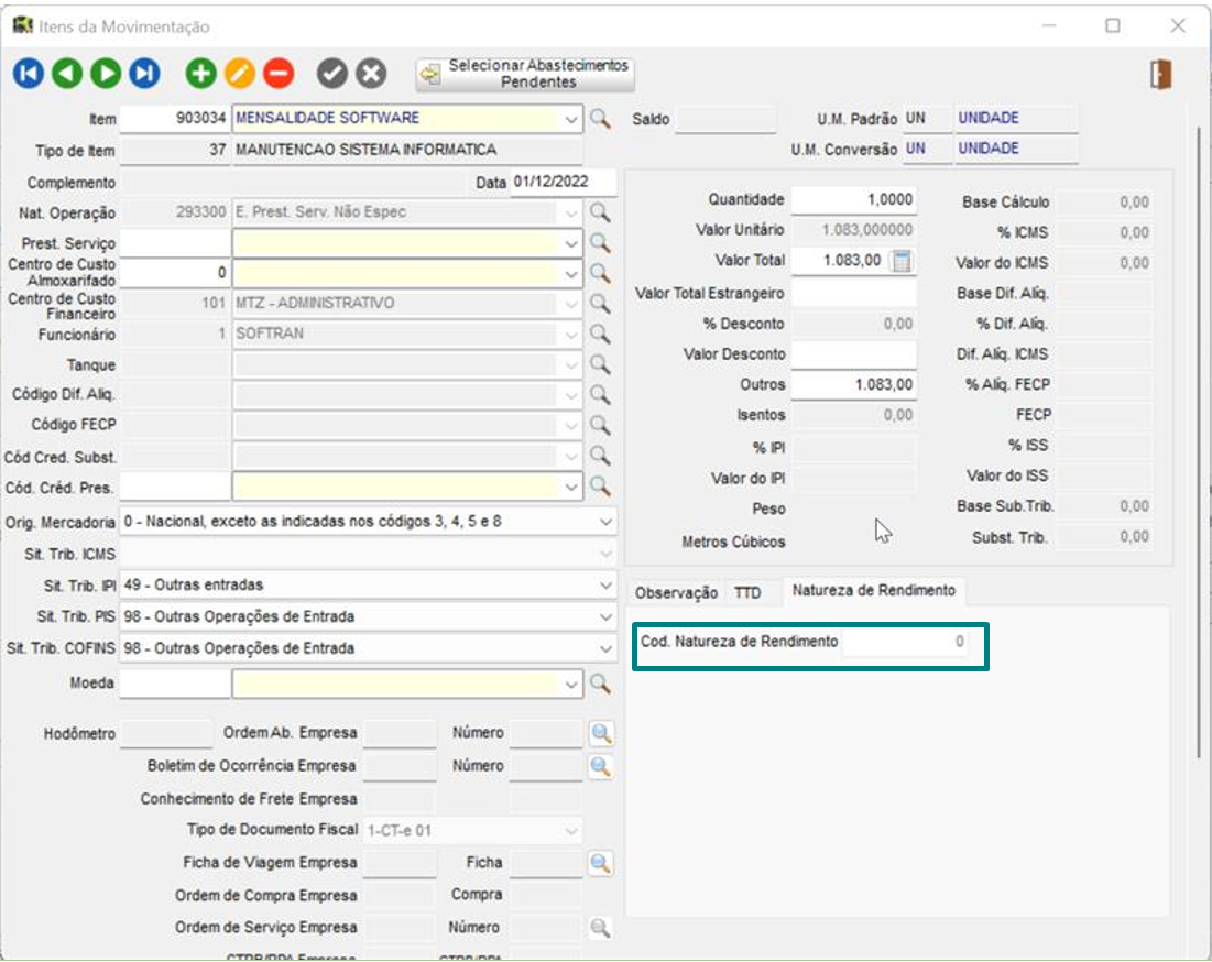 - No módulo SUP em Cadastros > Compras > Itens da Compra, é necessário definir a natureza de rendimento do item da compra. Após configurado o código do item de compra, esse é apresentado, somente para fins de histórico, na guia Natureza de Rendimento na movimentação do item da Nota de Recebimento.