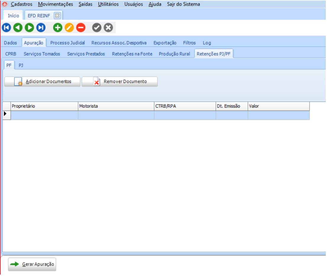 No módulo SPD em EFD REINF > Apuração > Retenções PJ/PF, na guia PF, adicione os documentos desejados clicando em Adicionar Documentos.