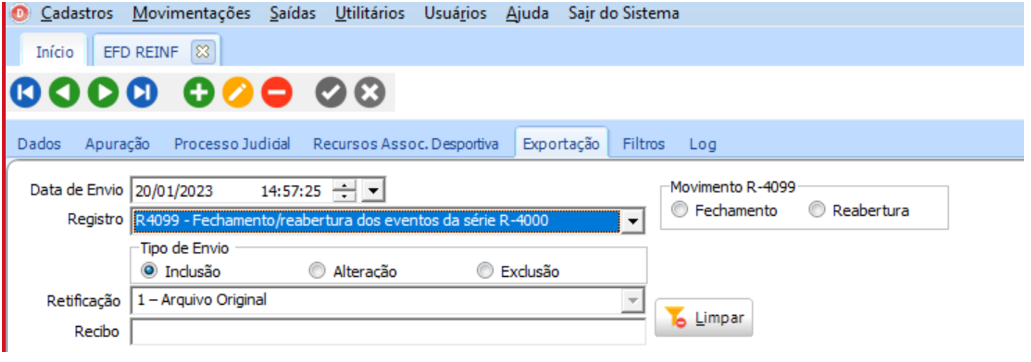 Para o envio do REINF com as retenções PF e PJ é necessário gerar também o registro R-4099 – Fechamento/Reabertura dos eventos da serie R-4000, definindo se o movimento é se fechamento ou reabertura através do campo Movimento R-4099
