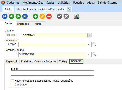 No módulo CFG, em Cadastros > Usuários > Vinculação entre Funcionários e Usuários. Selecione o usuário que irá acessar o sistema e realizar a requisição. Na guia Compras, a opção Comprador deve estar desmarcada: