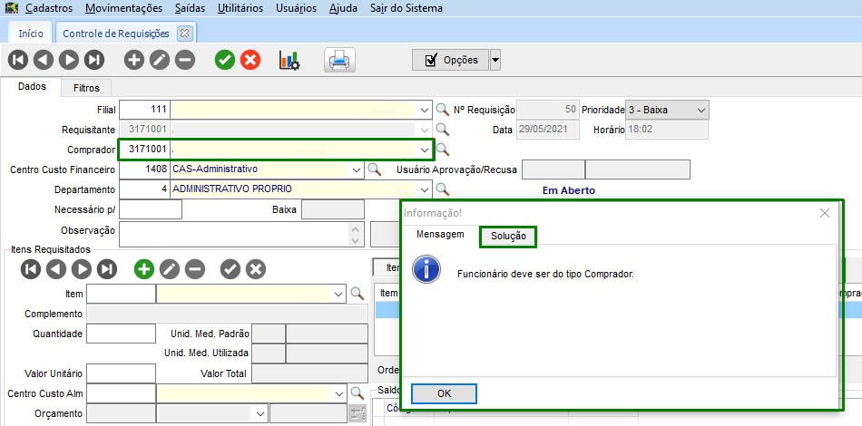 No módulo SUP, em Movimentações > Requisições > Controle de Requisições, crie uma nova requisição e clique em gravar. O sistema emite a mensagem que o funcionário deve ser do tipo comprador (na guia solução da mensagem, está o caminho da configuração acima).