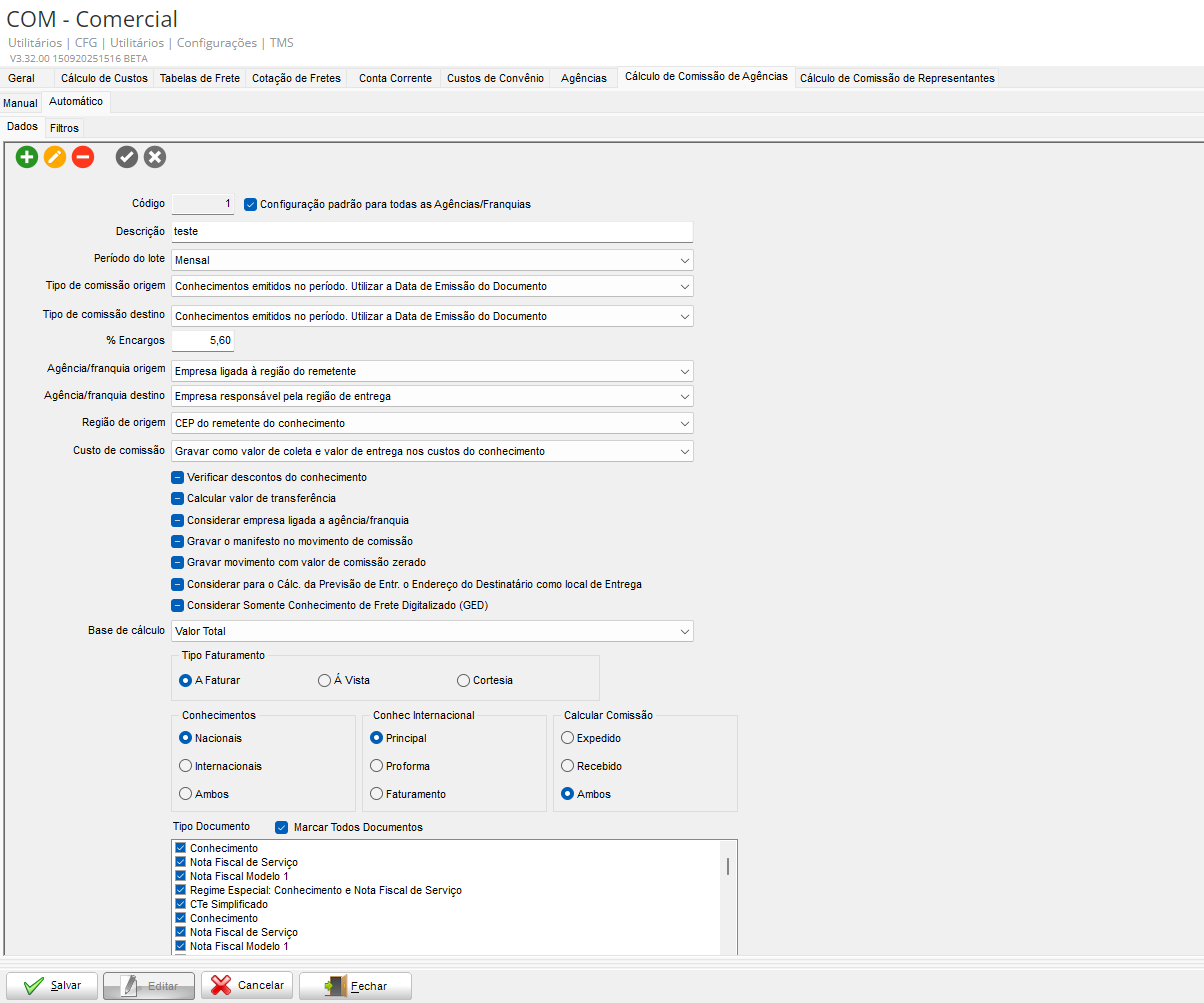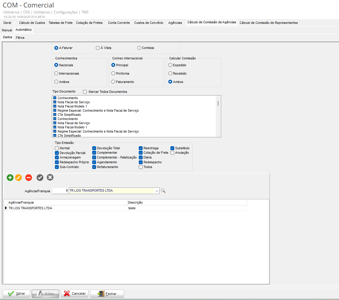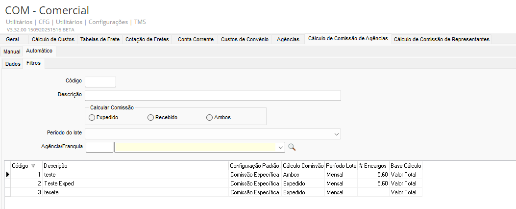 No módulo CFG, acesse: Utilitários > Configurações > TMS > COM – Comercial > Cálculo de Comissão de Agências