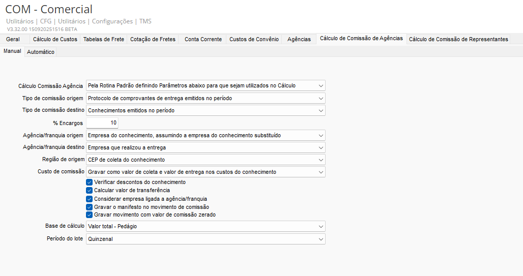 Na guia Manual, é possível configurar o Cálculo Comissão Agência por diferentes opções: