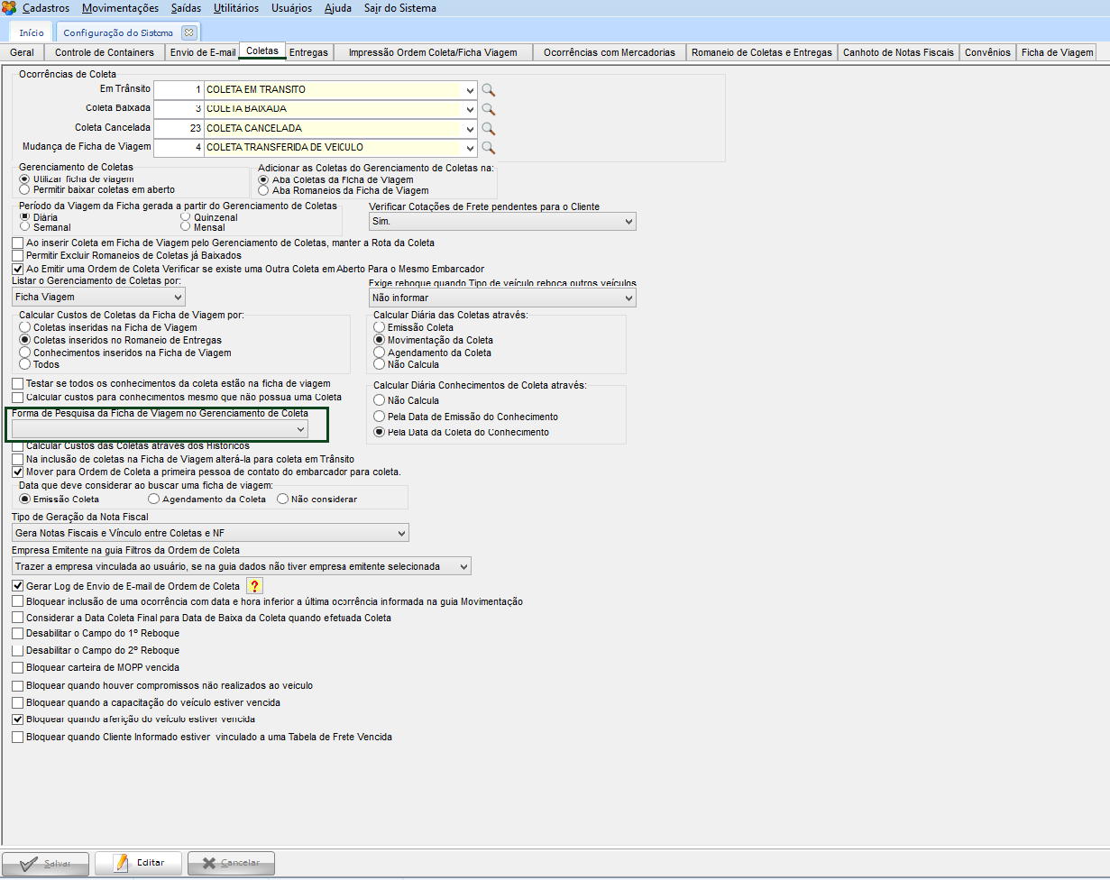 Nas configurações gerais do módulo, marcar a configuração da forma de pesquisa da ficha de viagem no gerenciamento de coleta, como Por Número de Coleta – Não questionando usuário, sempre criando, caso não existe ficha de viagem
