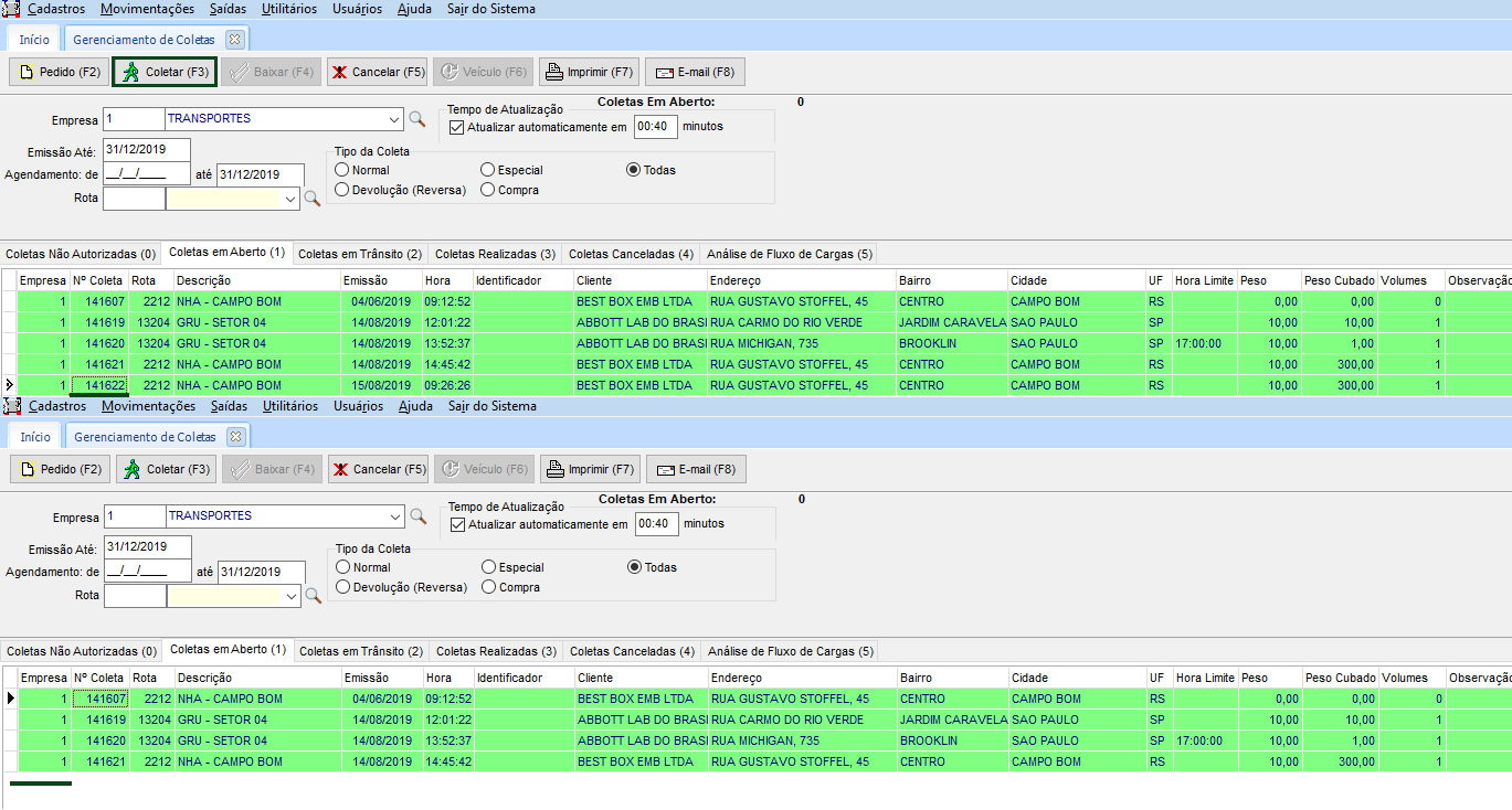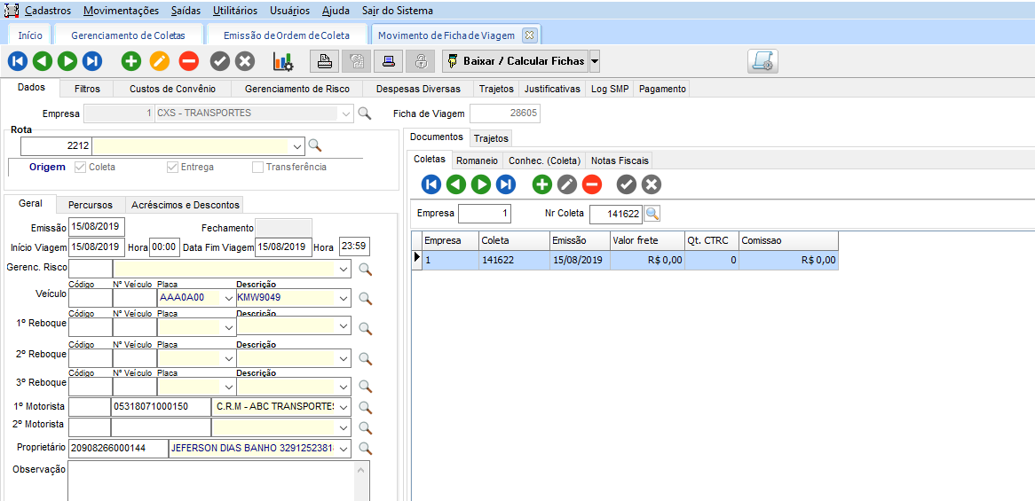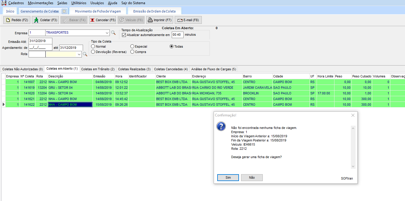 Na tela do gerenciador de coletas, ao efetuar duplo clique, ou pelo botão Coletar (F3), o sistema gera a ficha de viagem automaticamente, sem questionar o usuário deste processo.
