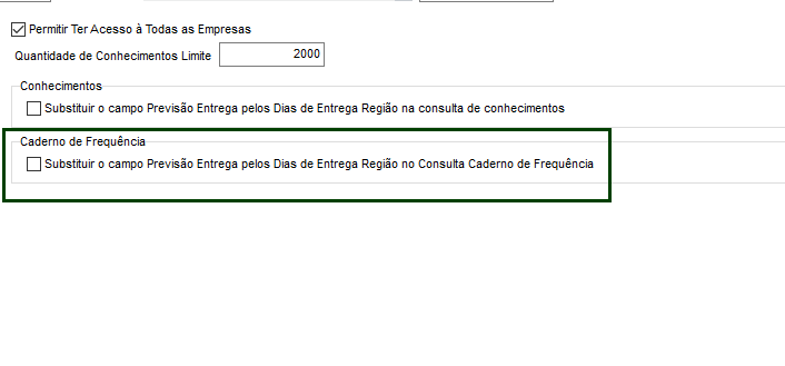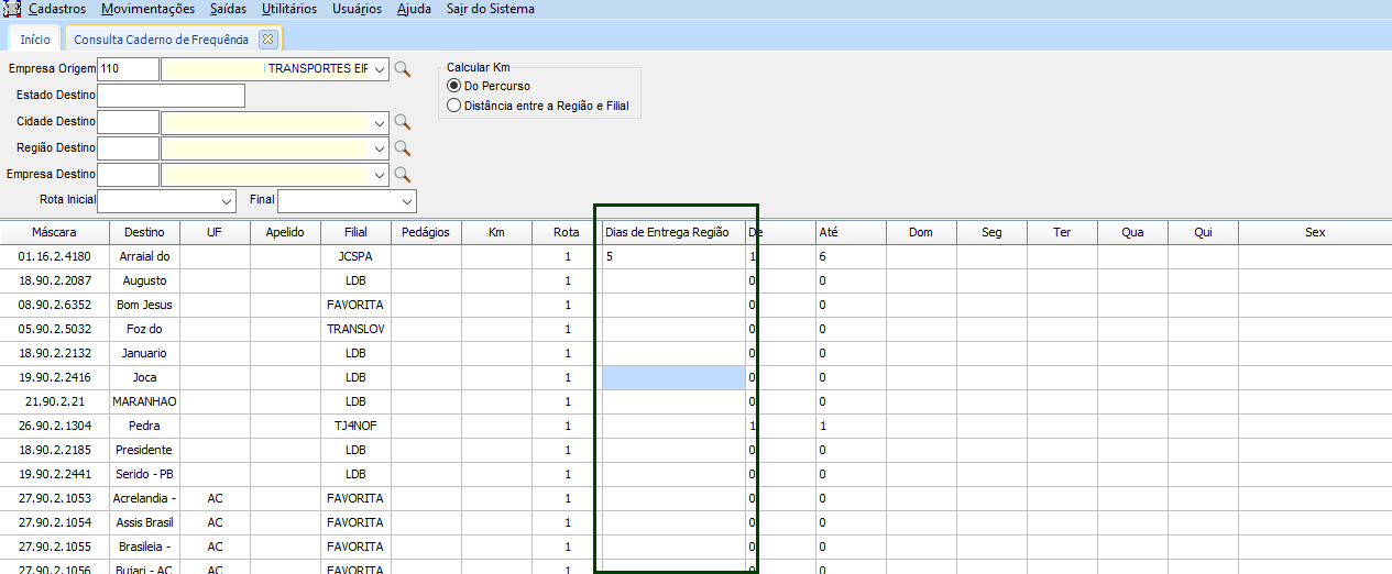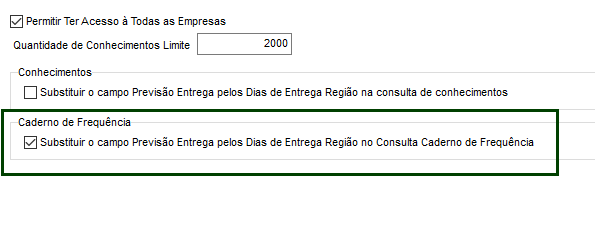 Na rotina de consulta de Caderno de Frequência é possível habilitar e desabilitar a coluna Dias de Entrega Região. Para que somente a área comercial e operacional tenham acesso aos prazos das regiões. conforme opção marcada nas configurações o sistema permite substituir a descrição da coluna na tela de Consulta Caderno de Frequência. Essa configuração tem por objetivo controlar o acesso à estas informações, somente para usuários permitidos de acordo com o seu setor.