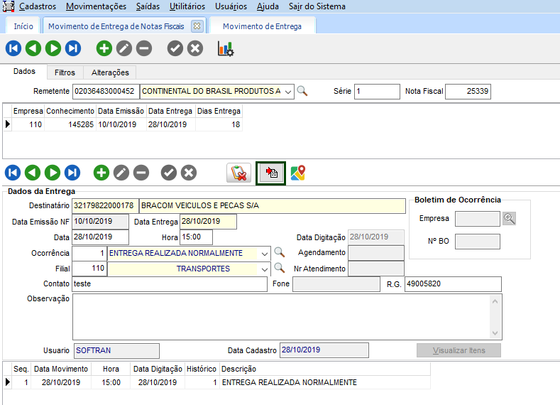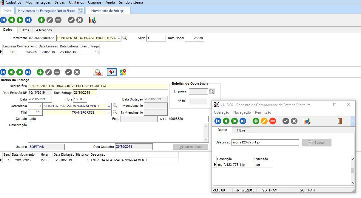 A rotina permite acessar os comprovantes de entregas das NFe na tela de histórico de entrega por nota, para que após a baixa do Roteirização e Monitoramento possamos consultar de maneira fácil esta informação. Ao realizar a baixa por NF-e no Roteirização e Monitoramento, a mesma é registrada no TMS e grava o comprovante de entrega caso exista. Esta conferência será realizada através do botão Comprovante de Entrega. O sistema cria uma pasta por empresa do CTe com o dia entrega para não sobrecarregar o diretório raiz e mantermos uma organização.