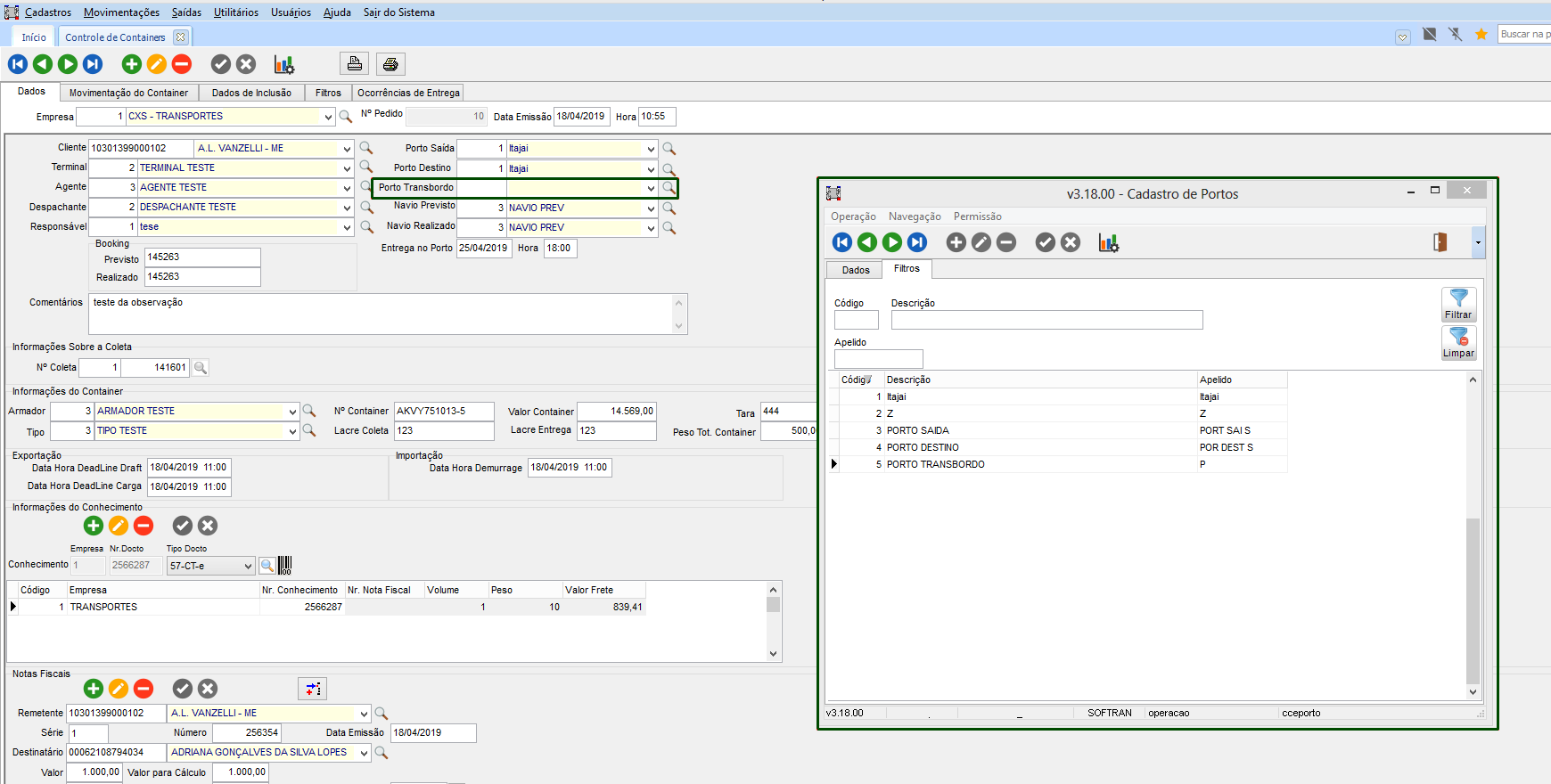 Os campos “Porto Transbordo” e “Peso Total Container” serão definidos no Cadastro de Containers, indicando qual o Porto que fará o transbordo da carga e apresentar o valor do peso total que está no container no módulo CCE, em Movimentações > Controle de Container.