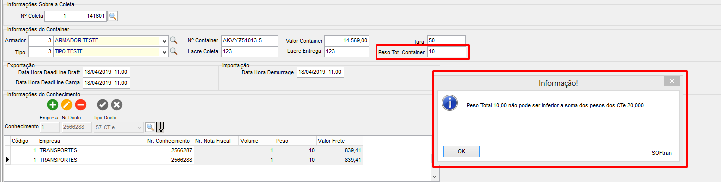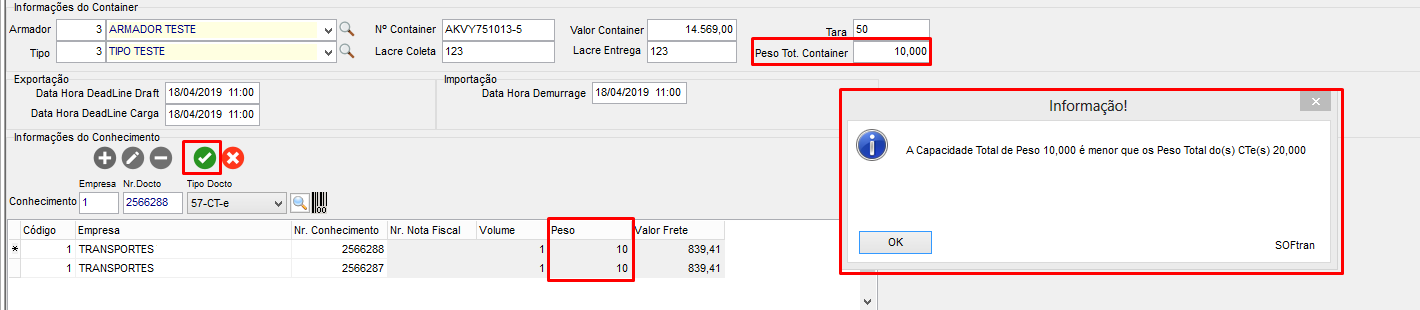 Caso for informado um Peso Tot. Container menor que a soma total dos pesos dos conhecimentos informados em tela, o sistema apresenta mensagem para o usuário.